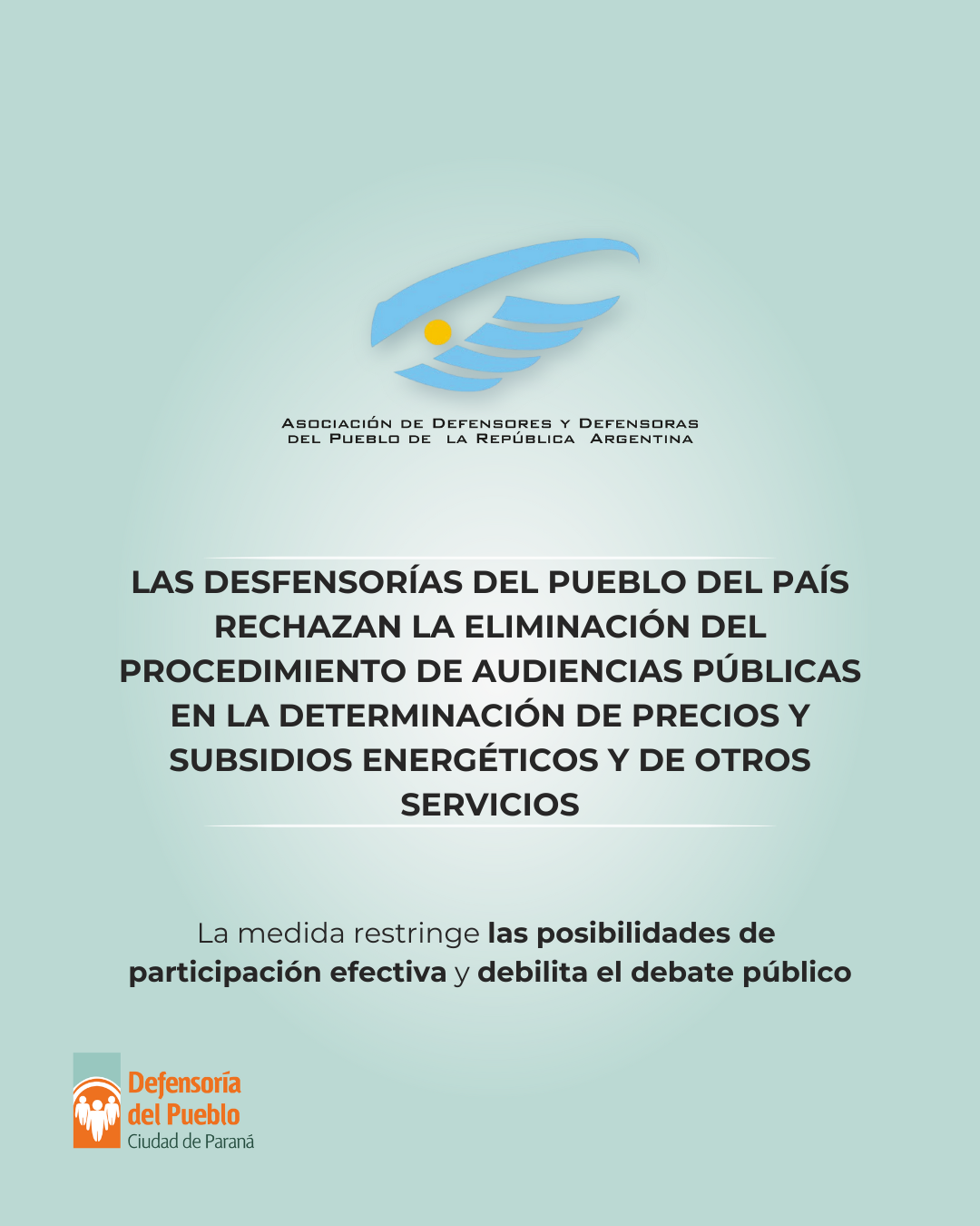 La Asociación de Defensores y Defensoras del Pueblo de la República Argentina (Adpra), organización de la que es parte la Defensoría del Pueblo de Paraná, manifiesta su profunda preocupación frente a la decisión del Poder Ejecutivo Nacional de eliminar el procedimiento de audiencia pública, en el marco del nuevo esquema previsto para la definición e […]