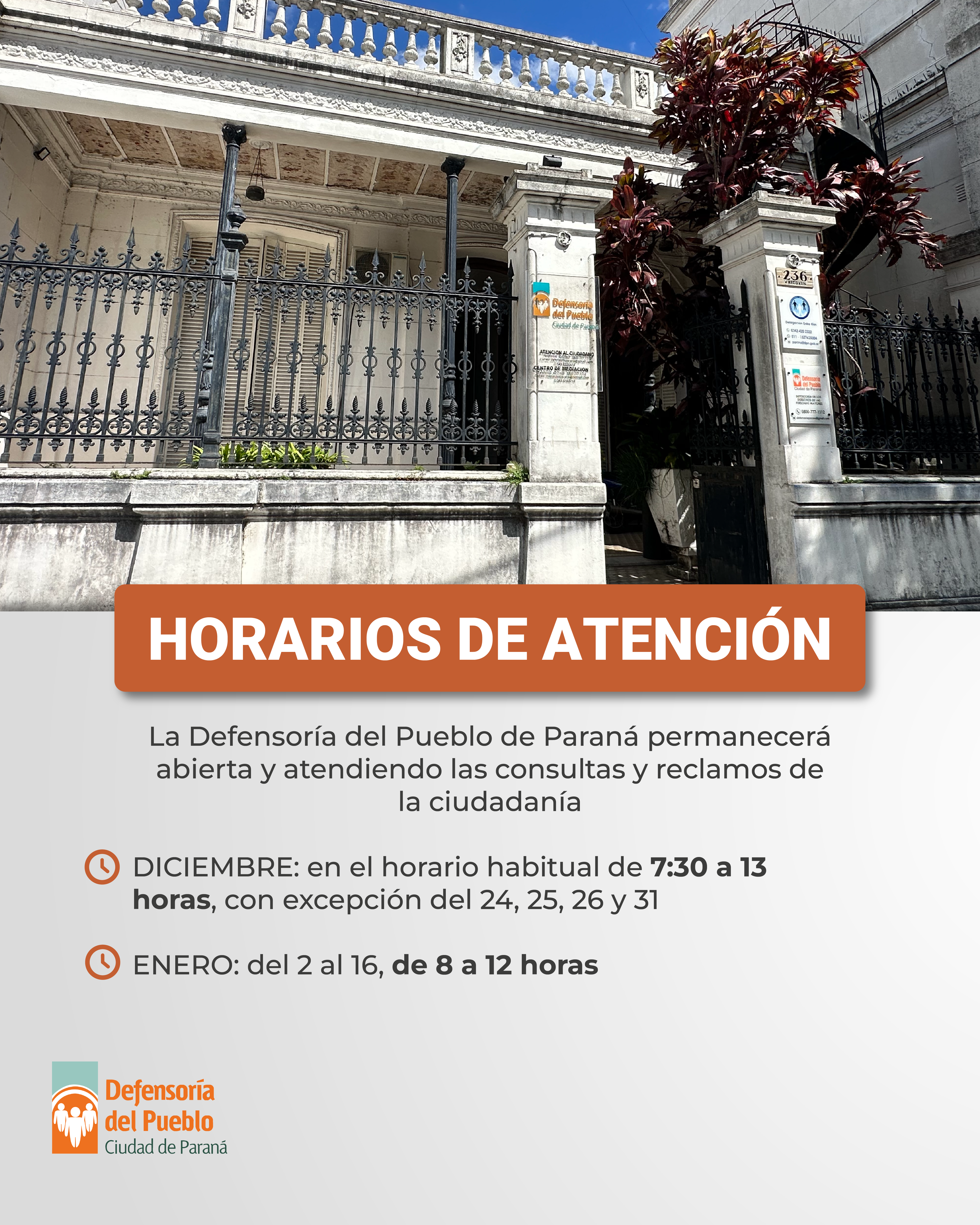 La Defensoría del Pueblo de Paraná permanecerá abierta y continuará atendiendo las consultas y reclamos de la ciudadanía, con excepción del 24, 25, 26 y 31 de diciembre, días abarcados por el feriado y el asueto administrativo. La institución atenderá en su sede de calle Yrigoyen 236 y a través de los teléfonos de línea […]