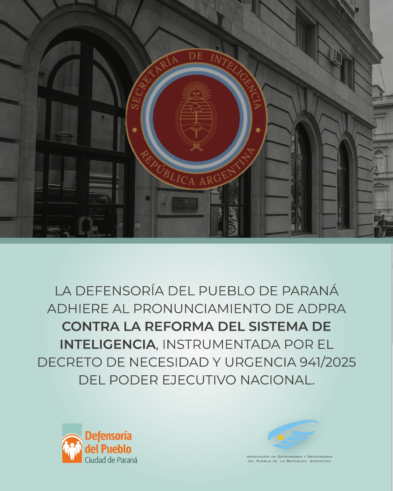 La Defensoría del Pueblo de Paraná, como miembro de la Asociación de Defensoras y Defensores del Pueblo de la República Argentina (Adpra), adhiere al pronunciamiento emitido por la asociación nacional contra la reforma del sistema de inteligencia instrumentada por el Decreto de Necesidad y Urgencia 941/2025 –publicado el 2 de enero de 2026–. La medida […]